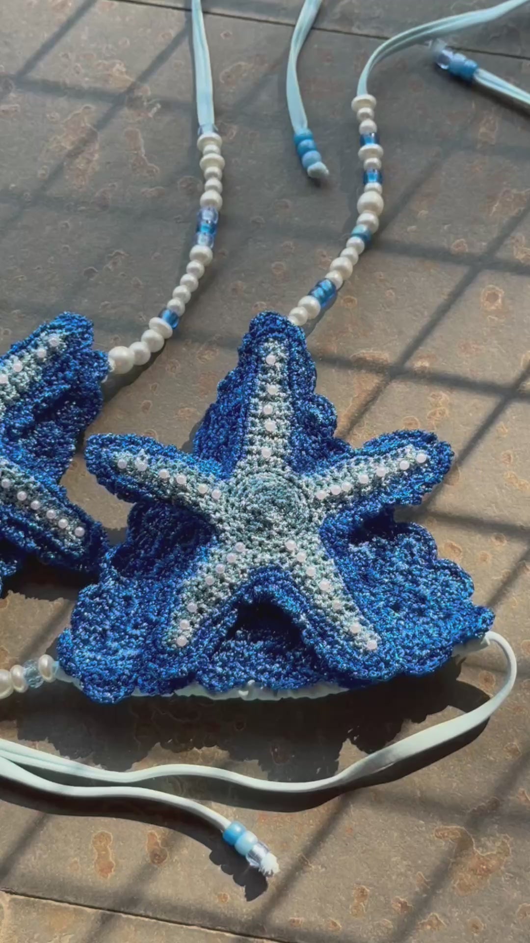 This knit bikini top is completely handmade by our artisans. Embellished with a starfish on each side. It's paired with Brazilian-cut bottoms and adorned with approximately 150 hand-applied faux pearls.